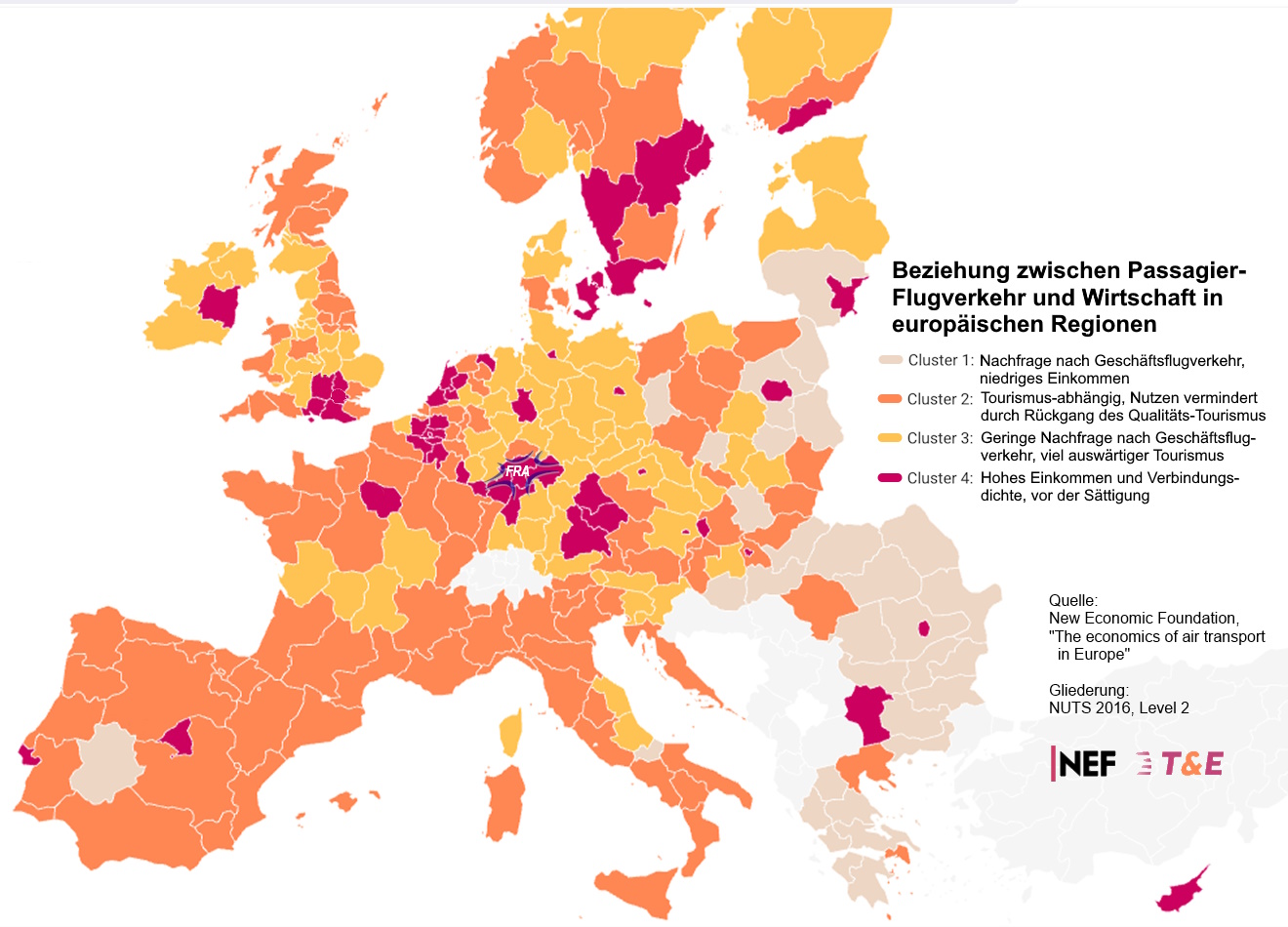 „Der Rückgang der Luft-Konnektivität als Wachstumstreiber ist in jenen Regionen am stärksten, in denen der Geschäftsreise-Flugverkehr zurückgegangen ist und in denen die Tourismus-Ausgaben im Netto-Defizit sind (d.h. eine Region sendet mehr Touristen aus als hereinkommen) - hauptsächlich die Cluster 3 und 4 in unserer Typologie. Diese Regionen sind besonders häufig in Belgien, den Niederlanden, Großbritannien und Deutschland.“